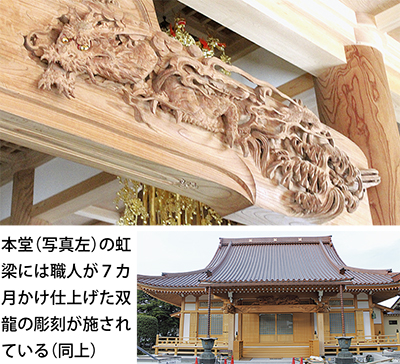 見どころのひとつが彫刻師7人が7カ月間、作業場で寝泊まりし仕上げた本堂内の彫刻。中でも長さ約5.4m、45cm角のケヤキ材を彫り出した双龍の虹梁(こうりょう)は見もの。