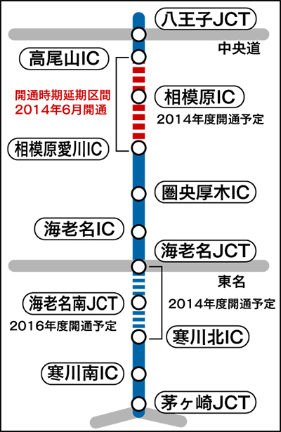 国土交通省関東地方整備局と中日本高速道路(株)(NEXCO中日本(株))は昨年末、今年3月末までの完成を目指し工事を進めている、さがみ縦貫道路(圏央道)の相模原愛川インターチェンジ(IC)―高尾山IC間14・7キロメートルの開通時期を2014年6月に延期すると発表した。