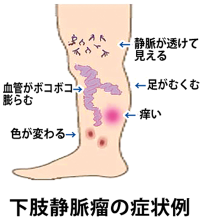 肢の静脈の血流が逆流し、血管がボコボコと膨らみ腫れてきます。足が重い、だるい、つる、むくむなどの症状がおきます。