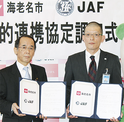 海老名市と一般社団法人日本自動車連盟神奈川支部(JAF神奈川支部)が3月24日、地域観光振興などを目的とした協定を結んだ。JAFが自治体と協定を締結するのは県内では初となる。