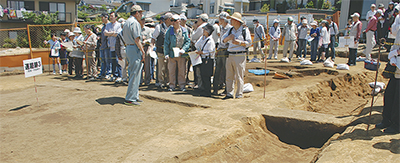 望地1丁目から2丁目にかけて広がる遺跡地内に位置する宅地造成地で5月17日、発掘調査見学会が開かれ、道路遺構や縄文期の竪穴住居跡などが市民に公開された。