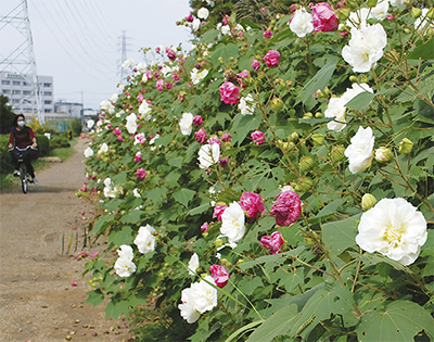朝から昼、夕方へかけて徐々に色を変える酔芙蓉(すいふよう)の花が市役所西側の横須賀水道路の遊歩道で見ごろを迎え、秋の訪れを告げている。