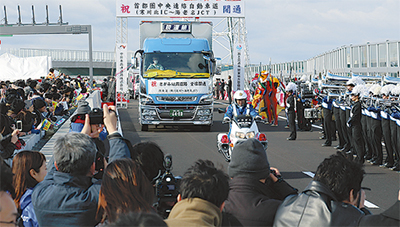 「通り初め式」では、地元企業などの車両が真新しい道路を実際に走り感触を確かめていた。