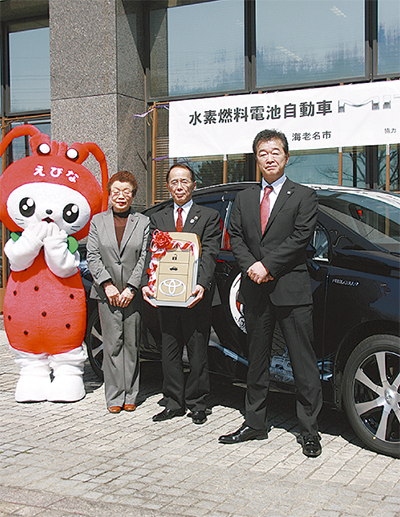 走行時に排気ガスを出さない燃料電池車は「究極のエコカー」として自然保護の面からも大きな期待が寄せられている。納車式の冒頭で挨拶に立った内野市長は、県内で3番目となった公用車のエコカー導入に際し各方面へ感謝の意を述べると共に、市内中新田に開設済みの「水素ステーション」(一般車のガソリンスタンドに相当)と併せた、環境面でのPRなどについても言及。また市川氏は自身、トヨタの営業マンとして海老名を担当していた当時のエピソードを披露しながら「今後も(街づくりの)パートナーとして歩ませて頂ければ」と話していた。