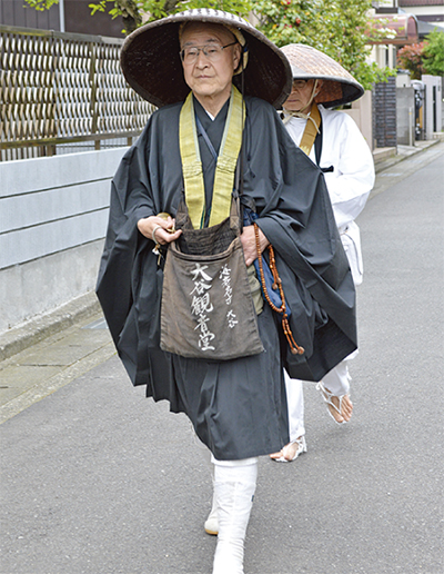 「大谷観音堂」の小林義功和尚が、海老名市内の家々を1軒1軒、市民の生活の幸せを祈り、経を上げて回る「托鉢」を毎月2回行っている。始めてから今年で8年目となった托鉢は4月25日にも行われ、国分北周辺を歩いて回った。