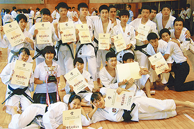 今年の同校は、出場する9人のうち7人が黒帯を所持しており、実力者同士が日ごろから切磋琢磨してきた。県大会では女子単独演武と女子組演武、女子団体演武の3種目で優勝。また、男女とも組演武で準優勝者も出るなど、存在感を見せつけた。