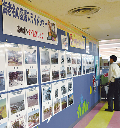 市内中央の「イオン海老名ショッピングセンター」3階にある休憩スペース「えび〜にゃ広場」で開催されている市内各所の今と昔を比較した写真展「海老名の変遷スライドショー」が今月で1周年を迎える。