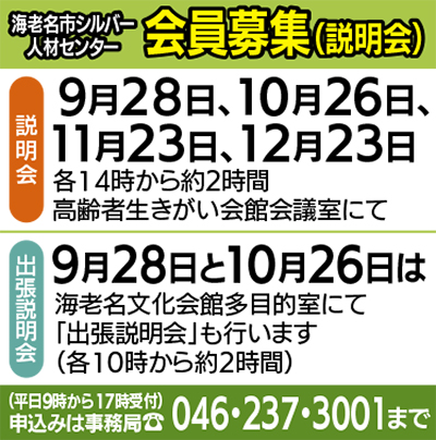 また、いわゆる「シルバー人材」として、活躍の場を求める海老名市民を対象とした「会員募集説明会」も開催している(左欄)。