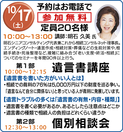 積水ハウス(株)では、各地で好評の「相続手続き講座」を10月17日(土)に海老名で開催する。