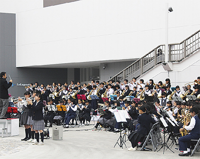 駅西口と東口の往来をスムーズにする「自由通路」の開通や「市立中央図書館」の全面改装など”東西一体のまちづくり”が具現化しつつある海老名駅西口エリア。10月10日には市が主催する「まち開き記念式典」が行われ、土地区画整理事業により誕生した「扇町」のために尽力した関係者などが多数出席。沢山の祝辞と市内の中学校吹奏楽部による演奏=写真=などで新たな門出を盛り上げていた。