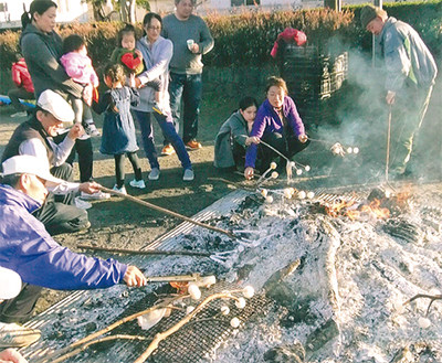 1月10日には大谷近隣公園で催され、約50人の地域住民が参加。正月の松飾りやしめ縄、書初めなどを持ち寄り、積み上げて燃やし、その火の中に枝の先に付けた団子を入れ、焼きたてを楽しんだ。子どもたちは頬をいっぱいに膨らまし舌鼓を打っていた。参加者は「こうした伝統行事を後世にも伝えていきたい」と話していた。