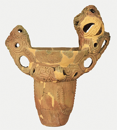 海老名開催での目玉になるのは、1973年に上今泉中原遺跡で発見された「深鉢型の縄文土器」。国道246号線工事に伴う発掘調査で見つかったもので、装飾が施されていることから、儀礼等で使用されたものではないかと言われている。また、縁の部分に穴が開けられた「有孔鍔付(ゆうこうつばづき)土器(どき)」と呼ばれる珍しい品も展示される。
