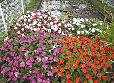 昨年5月から植えつけを始め、児童は肥料や水やりなどを担当。育成過程で食紅水を使い根が水を吸う様子を観察したり、花の浄化作用で水生生物が生息できるビオトープが形成される様などを学習した。手塩にかけて育てたサンパチェンスが秋ごろに最盛期を迎えると、「素敵なものが出来た」と児童は皆笑顔を見せていたという。