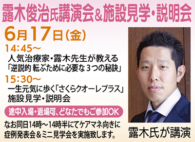 松田さんが働く「さくらクオーレプラス」は、歩ける・転ばない・転んでも骨折しない、という「歩行機能トレーニング」に特化したデイサービス。このコンセプトに伴い、訓練プログラムを考案した露木俊治氏が無料講演会を開催する。途中入場・退場も可能で誰でも参加できる。