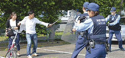 この訓練は、署員の緊急時の対応力強化と装備の確認を目的に、定期的に実施している。この日は大和市内のサッカーチームの事務所に刃物を持った男が立ち入り、職員を切りつけ、現金を強奪するという想定に基づいて実施された。