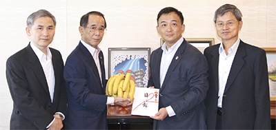 海老名市はこのほど、台湾・台北市でフルーツの輸出販売業を営んでいる「リンクスブリッジ」の林志鴻(りんしこう)さんから、市内園児用のバナナ300本の寄贈を受けた。市役所を訪れた林さんから、内野優市長が直接受け取った。