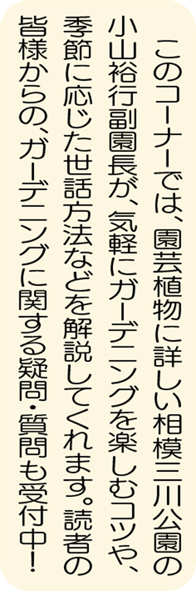 ※ガーデニングの疑問・質問に答えて欲しい方は、質問事項をなるべく詳しく記載し〒242-0004大和市鶴間1の21の8沖津ビル2階 タウンニュース海老名編集室「ガーデニング」係まで。