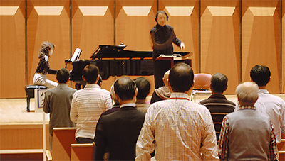 練習では、国内外で活躍する指揮者・乾健太郎氏が歌声をチェック。分かりやすいアドバイスで参加者に指導した。