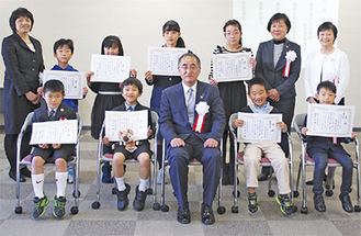 「第1回海老名 図書館を使った調べる学習コンクール」の表彰式が11月26日に市役所で開かれ、入賞した小中学生8人が伊藤文康教育長から賞状を受け取った。
