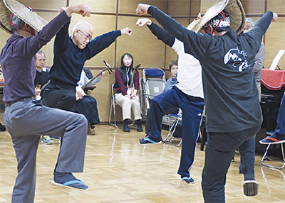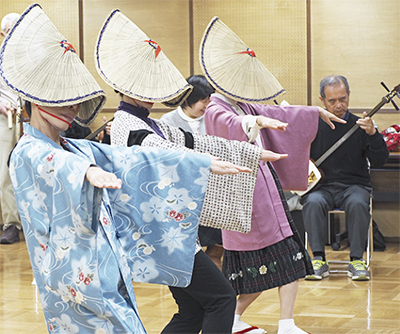 おさらい会を前に現在佳境を迎える練習には、女性30人、男性20人の会員が参加。踊りのほか、地方(じかた)と呼ばれる三味線・胡弓・太鼓・囃子・歌の練習を熱心に行っている。特に心掛けているのは、踊り手全員の顔や手の角度がぴったりと揃うこと。練習中にも「最後揃っていなかったよ」「今は揃って動けていたね」などと声が飛び交っていた。