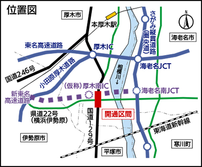 同事業は、戸田交差点の北側に計画されている新東名高速道路(仮称)厚木南インターチェンジ(18年3月末までに開通予定)と、国道129号線を結ぶ道路の整備にも取り組んでおり、総事業費は約228億円。