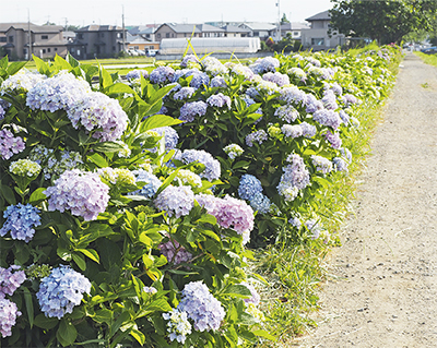 中新田小学校南側の貫抜川沿いに植えられているアジサイが現在見頃を迎え、道行く人の目を楽しませている。