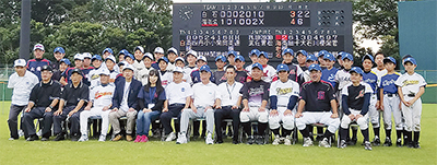 海老名市少年野球連盟に所属する24選手と姉妹都市・宮城県白石の選抜選手11人が、海老名市で試合を含めた交流を行った=写真。