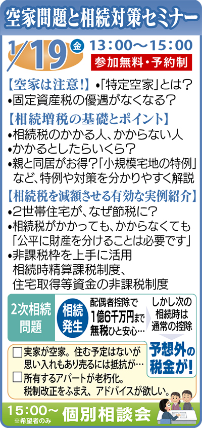 セミナーでは相続税の基礎やポイント、注意点を分かりやすく解説する。また「子どもが独立して夫婦2人では広すぎる自宅」「老人ホームに入居予定。自宅はどうする?」など、身近な実例を取り上げ対策を多数紹介。さらに賃貸(併用)住宅等を建てると相続税や固定資産税が大幅に軽減される仕組みも説明。役立つ情報が満載なのでぜひ参加を。※当日参加できない人にはセミナー資料を後日進呈(電話で申込みを)。