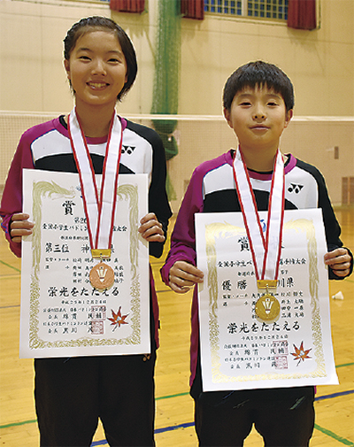 大谷小6年の齊田真歩さんと杉久保小5年の高橋和希君がこのほど、広島県で開催された「第26回全国小学生バドミントン選手権大会」都道府県対抗に県代表として出場し、高橋君をはじめとする男子チームは男子の部で優勝、齊田さんら女子チームは女子の部で3位と好成績を収めた。