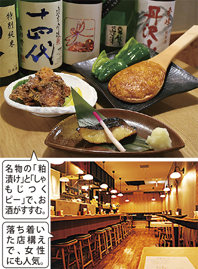 また、目の前の炉端で焼きあげる、創業文政13年・愛川町の大矢孝酒造の酒粕を使い板長が漬けた銀だらや豚ロースなどの「粕漬け」、人気の「しゃもじつくピー」が日本酒との相性抜群。