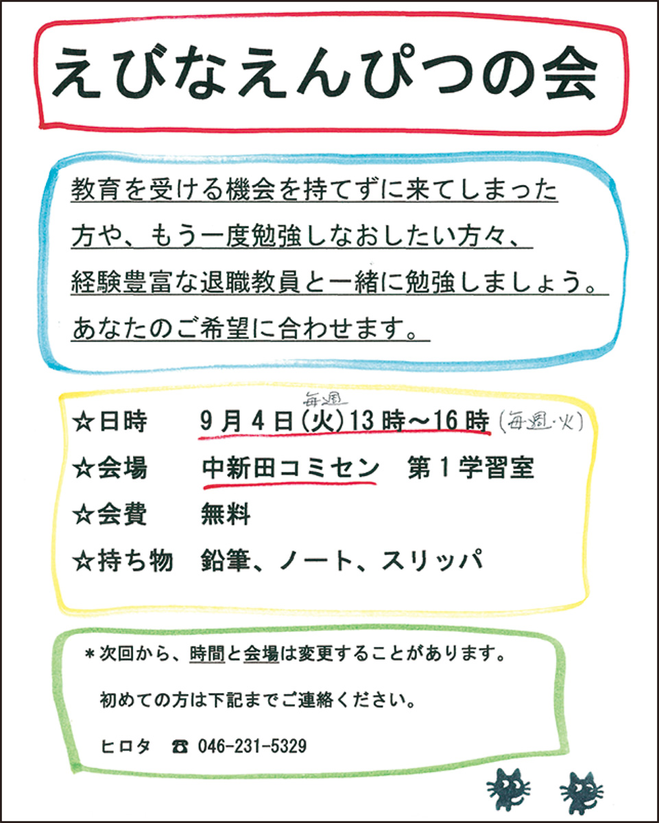 ボランティアが運営する自主夜間中学「えびなえんぴつの会」がこのほど発足し、不登校の学生から大人を対象にした学習の場を9月4日から毎週火曜日に提供していく。指導を行うのは退職した小・中学校の元教員たちで、科目は国語・数学(算数)・理科・社会・英語の5教科が中心。受講費無料で、学ぶ教科や教材は参加者一人ひとりの希望に応じて対応できマンツーマンで教えてもらえるのが特徴。実施場所は中新田コミセンの第1学習室、時間は午後1時から4時まで。持ち物は鉛筆・ノート・スリッパとなっている。