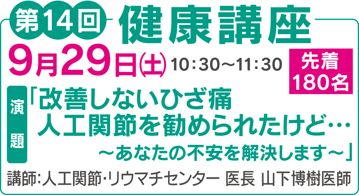 今回のテーマは「改善しないひざ痛・人工関節を勧められたけど…〜あなたの不安を解決します〜」を、同院人工関節・リウマチセンターの山下博樹医長が講話する。