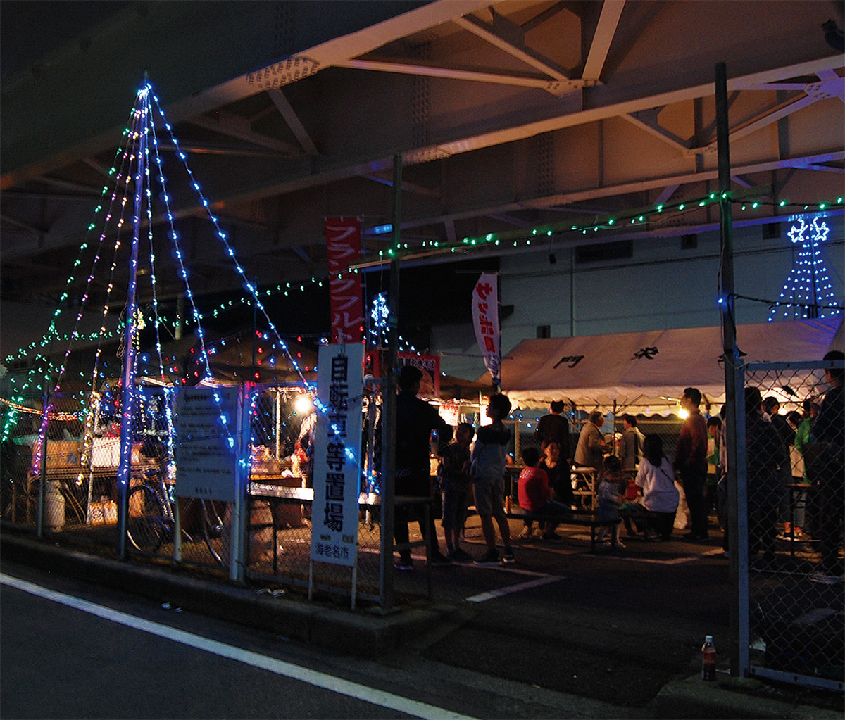 同地域の商店会「門栄会」(神部正会長)が12年前から実施しているもので、この日は門栄会メンバーが焼きそばやフランクフルトなどの露店を出店。光輝くイルミネーションを一目見ようと多くの子どもたちが集まったほか、自宅への帰り際に通行人が写真を撮る姿等が見られた。神部会長は「ご近所付き合いが希薄となっている中、こうしたイベントの中で繋がったり、子どもたちの思い出になれば」と話していた。