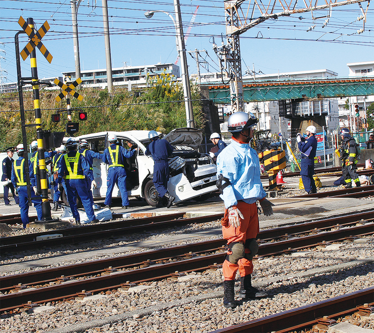 この日は、列車が踏切内で乗用車と接触し脱線したという想定で、小田急電鉄(株)・海老名警察・消防が連携し緊急出動や復旧作業訓練を行った。現場には本番さながらの緊張感が漂っていた。