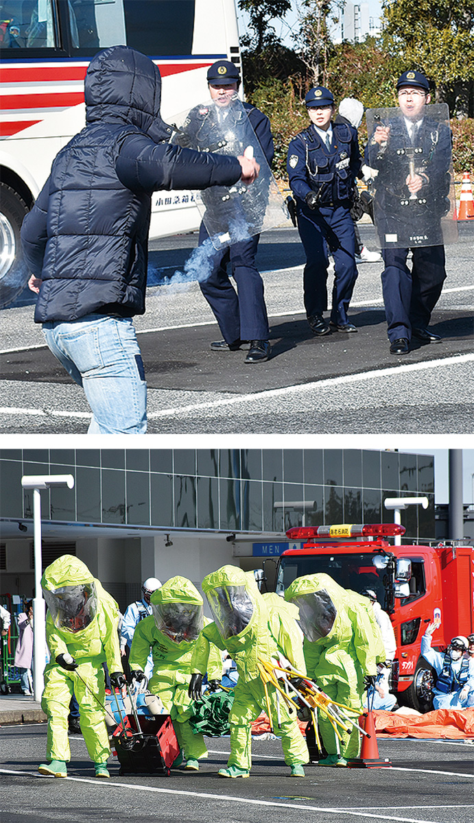 東京五輪の開催などに備えようと、大勢の人が行き来する海老名サービスエリア(SA)で合同テロ対策訓練が2月4日に行われた。