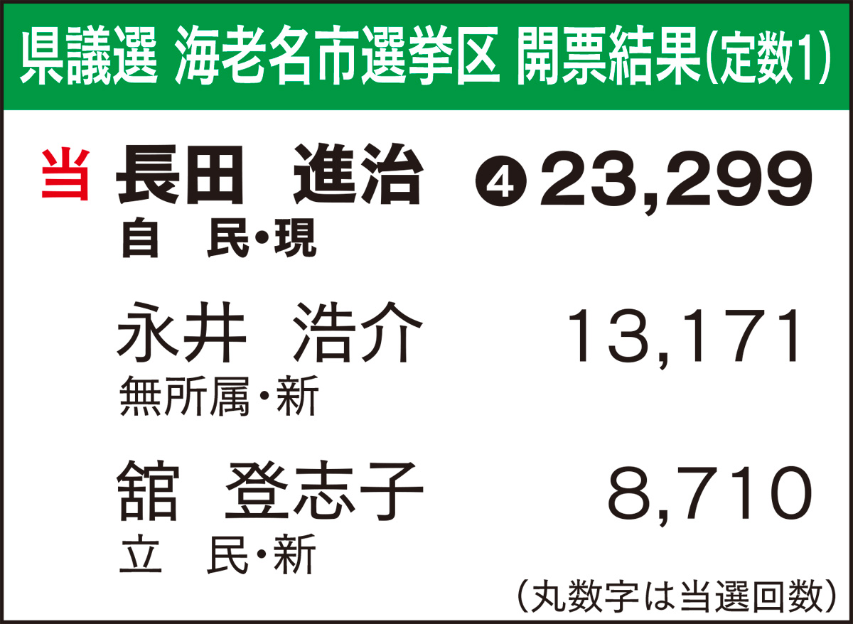 神奈川県議会議員選挙(海老名市選挙区・定数1)が4月7日に投開票され、現職の長田進治氏(自由民主党)が永井浩介氏(無所属)と舘登志子氏(立憲民主党)を破り、再選を果たした。有権者数10万9084人に対し4万5884人が投票した中、長田氏は2万3299票を獲得し、2氏に大差をつけ勝利した。