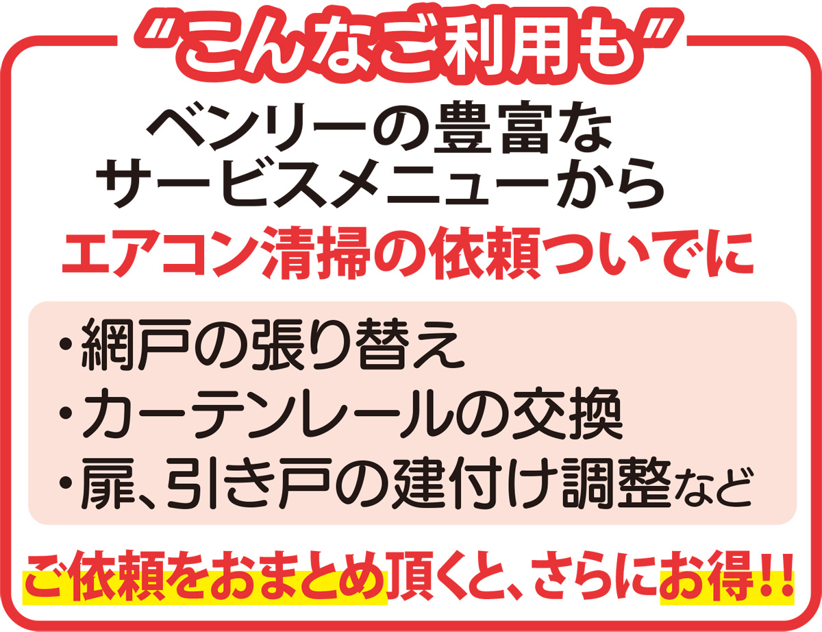 キッチンやお風呂など水廻りの清掃や修理から家具移動、網戸の張替ほか、害虫駆除や庭木の剪定、電球交換など、小さな事でも対応してくれる。