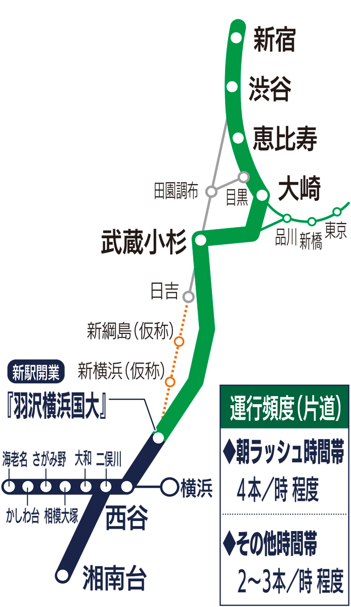 直通線は、相鉄・JR間の羽沢横浜国大駅が新設され連絡線を設けることで、海老名―横浜間だった相鉄線が渋谷や恵比寿など都心にも乗り換えなしで行けるようになる。海老名から武蔵小杉も利用できるようになり、最速36分で到着する。また終日の運行本数が46往復(92本)と発表。朝のピークは1時間に4本、その他の時間帯は2〜3本運行されるという。