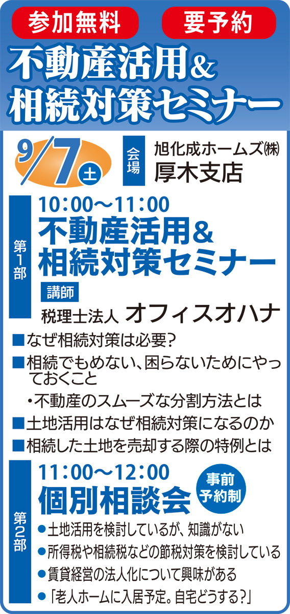 相続の中でも多数をしめる不動産資産の相続。せっかく相続した財産を活用してもらおうと旭化成ホームズ(株)では9月7日(土)、同社厚木支店を会場に「不動産活用&相続対策セミナー」を開催する。参加費無料。要予約。