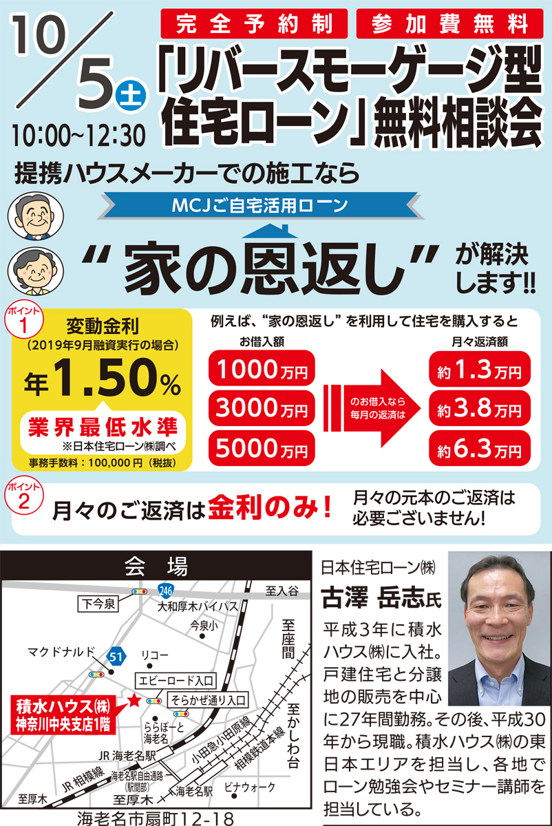 積水ハウス(株)では「リバースモーゲージ型住宅ローン」について無料相談会を10月5日(土)、積水ハウス(株)神奈川中央支店1階で行う。時間は午前10時から午後12時半(1組30分程度)。各地でローン勉強会やセミナー講師を務める、日本住宅ローン(株)の古澤岳志氏が担当する。