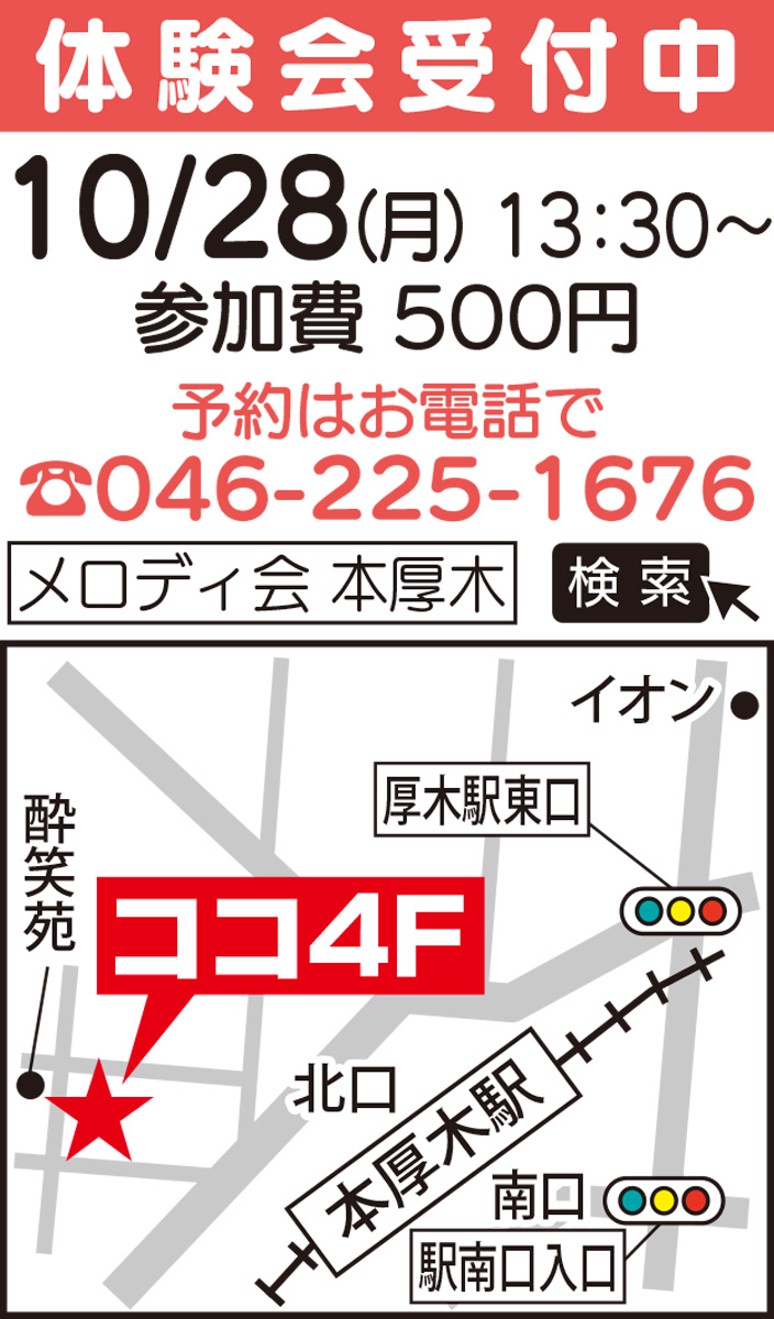 楽器に触れられる体験レッスンを現在受付中。10月28日(月)13時30分〜で参加費500円。問合せ・申込みは同会【電話】046・225・1676へ。