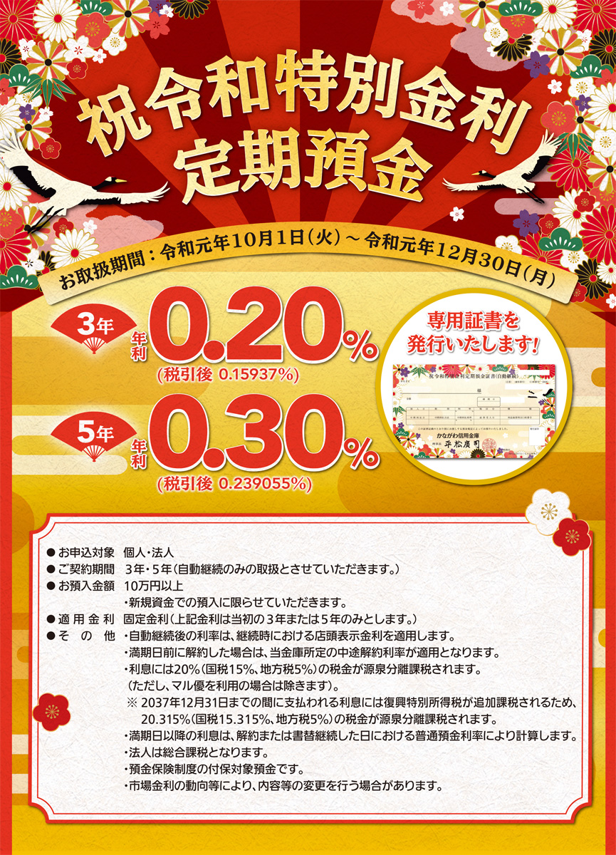 かながわ信用金庫(平松廣司理事長)では、新元号「令和」を祝した特別金利の定期預金を販売している。年利は契約期間3年で「0・20%」、5年なら「0・30%」。専用証書も発行される。