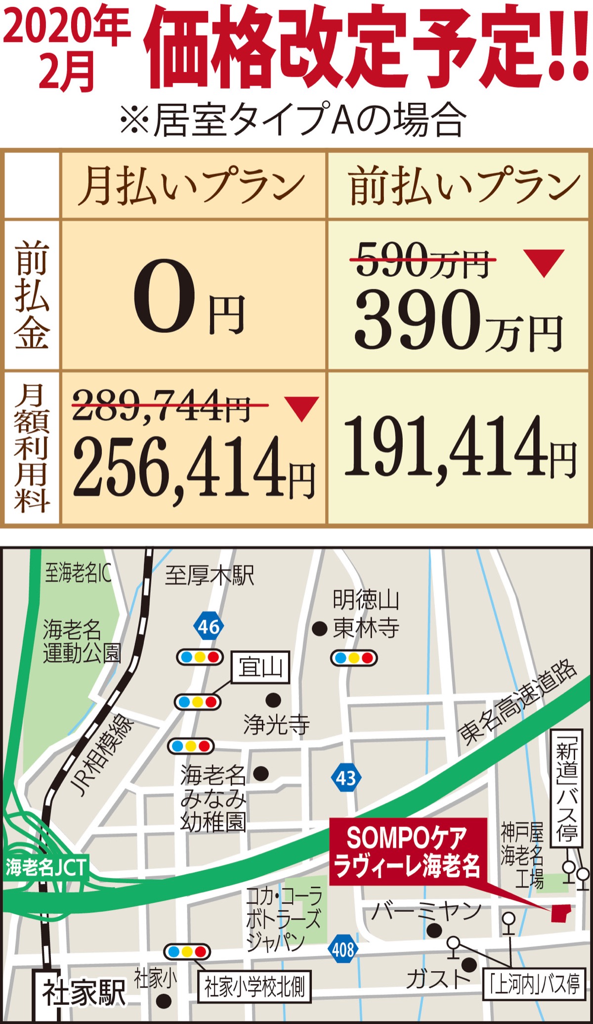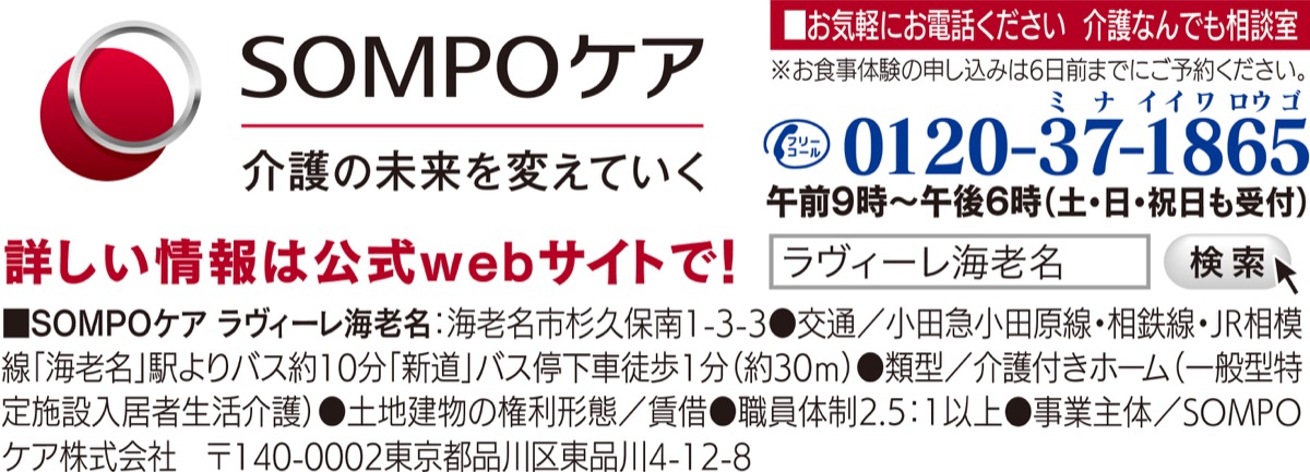 「SOMPOケア ラヴィーレ海老名」は、高級感溢れるホーム。玄関を入るとグランドピアノと心地よいBGMが迎えてくれる。受付スタッフのやさしい笑顔も印象的だ。広々としたレストランは、絵画が飾られ上品な雰囲気が漂う。約250坪の本格的な日本庭園は四季を身近に感じられ、潤いのホームライフを演出する。居室はすべて19平方メートル超の広さを確保。介護福祉士は10人と多数在籍しており、経験と知識に裏付けられたサービスが受けられ、認知症ケアや栄養ケア・マネジメント、医療的アプローチを提供している。特に生活の中で移動や立ち上がりなどの動作を通して行う「生活リハビリ」に力を入れている。「2月から一部の居室の前払金と月払家賃の価格を改定(予定)し、ご入居しやすくなります」と市原ホーム長は話す。ホームの特長や雰囲気を体験したい人は連絡を。