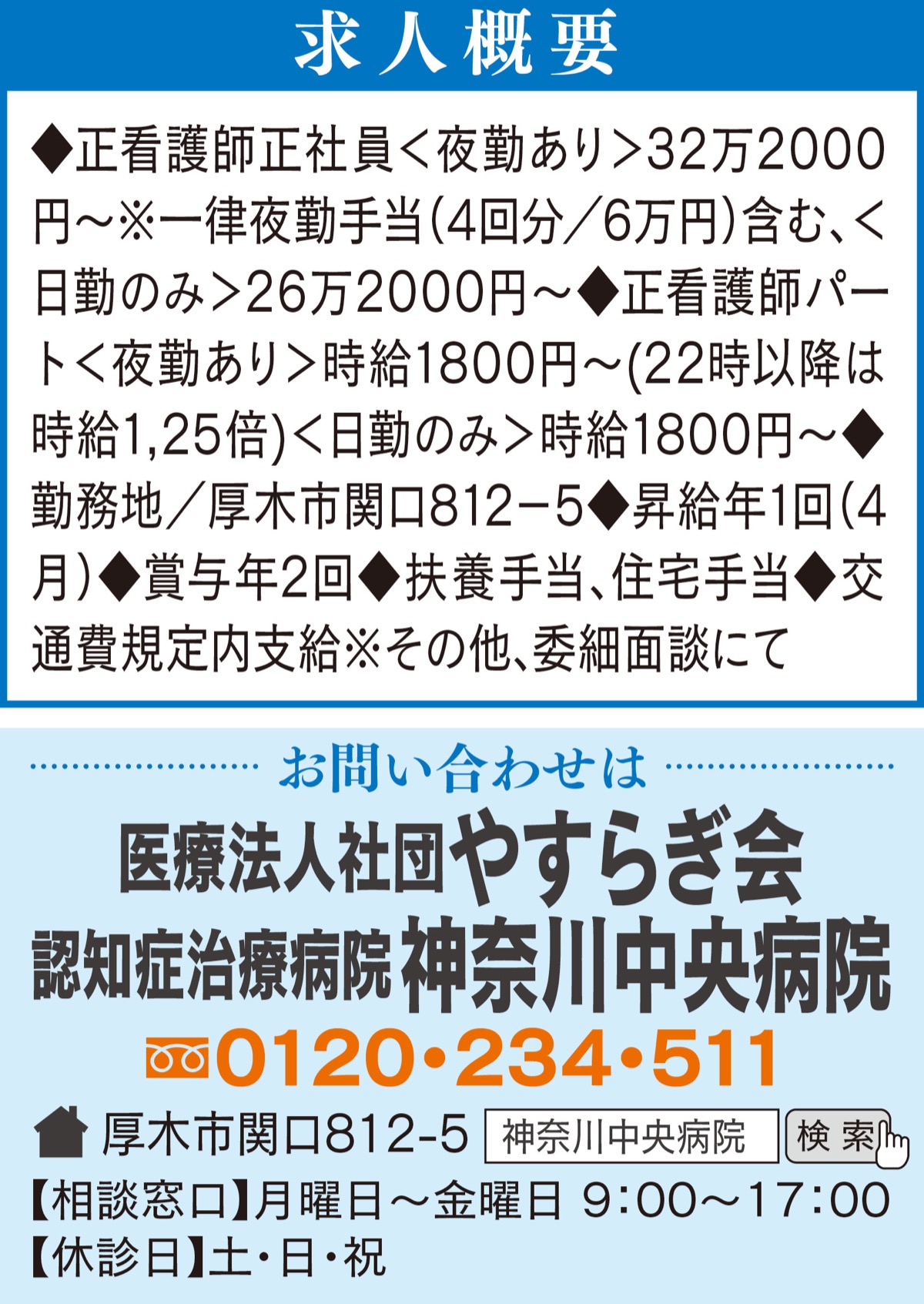 同院では物忘れ外来も受付中。「予防の意味でも気になる方は一度受診を。見学はいつでもどうぞ」と話している。また、看護師を募集中。「看護基準20対1のため、急性期のような慌ただしさはありません。患者さん一人ひとりに向き合える職場環境です」
