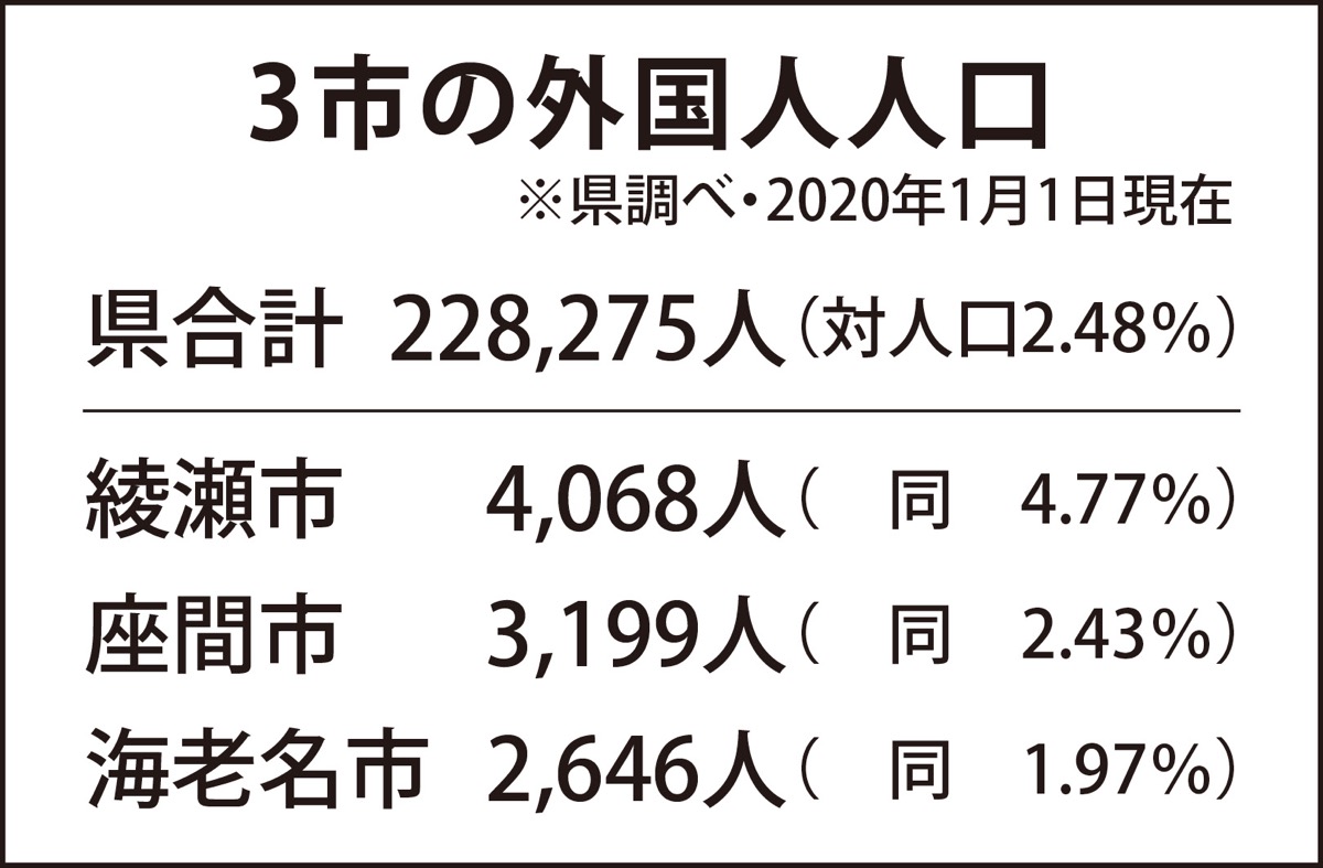 綾瀬市の外国人比率は4・7%で政令市を含む県内19市で1位。愛川町(7・1%)と箱根町(5・3%)に次ぐ県内3位で、座間市は10位(2・4%)、海老名市は14位(1・9%)。