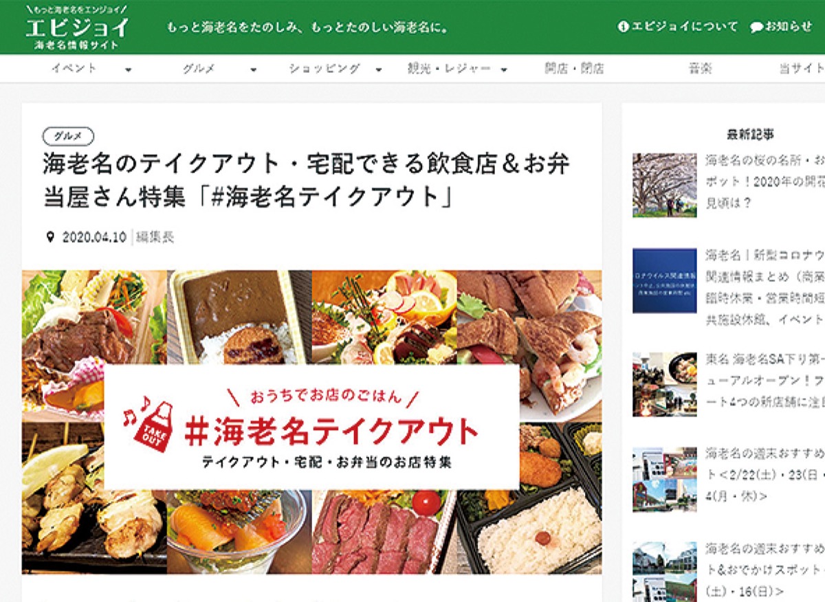 海老名では、グルメやイベントなど海老名に関する情報を発信するウェブサイト「エビジョイ」がいち早く、特設サイト『#海老名テイクアウト』を立ち上げた。
