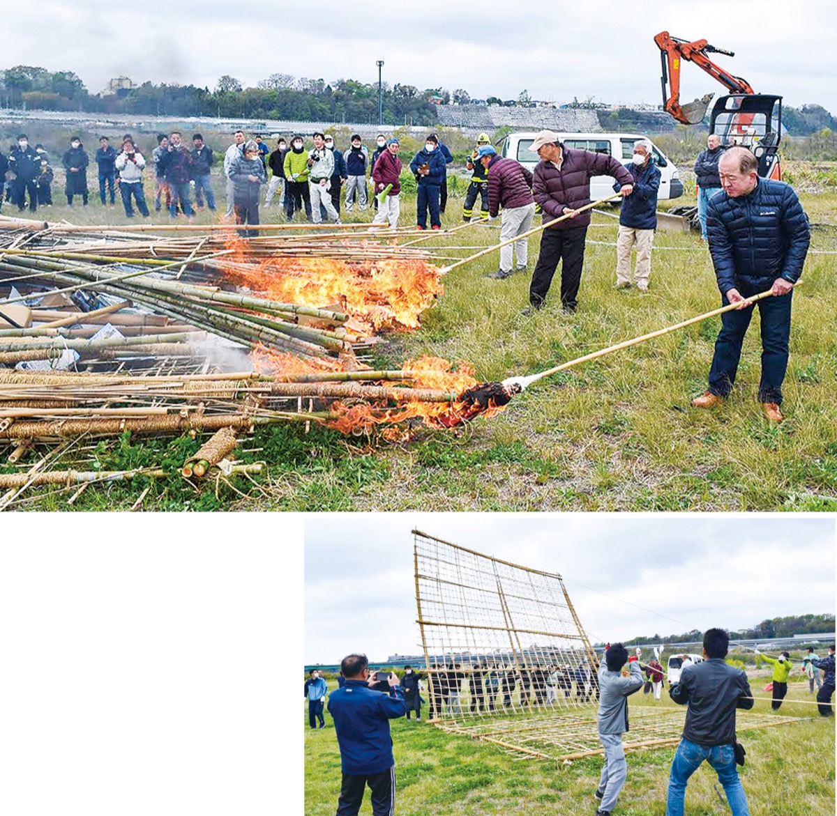 新型コロナウイルスの感染拡大の影響で中止となった今年の「座間市大凧まつり」で掲揚するはずだった大凧のお焚き上げが12日、相模川河川敷で行われた。