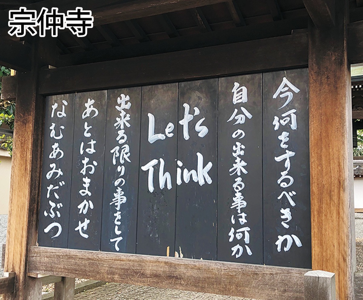 宗仲寺の門前に「今何をするべきか 自分の出来る事は何か Let‘s Think 出来る限りの事をして あとはおまかせ なむあみだぶつ」の文字。まさに今を表すお言葉。まずは「出来る限り」を…。