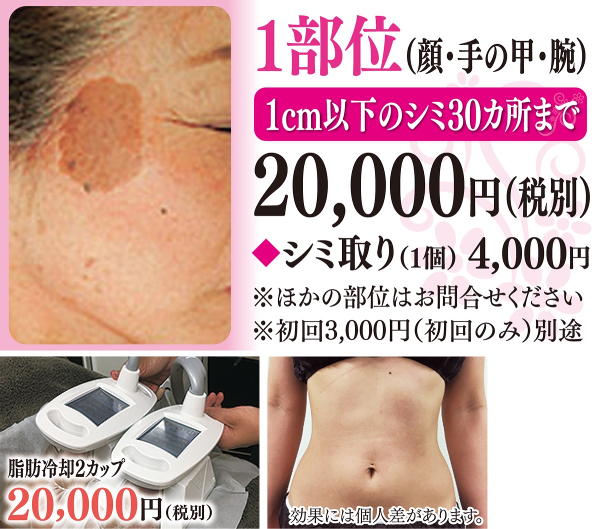 あやせ整形外科・眼科内にあるメディカルエステのシミ取り放題コースでは、定額で30カ所まで施術可能。