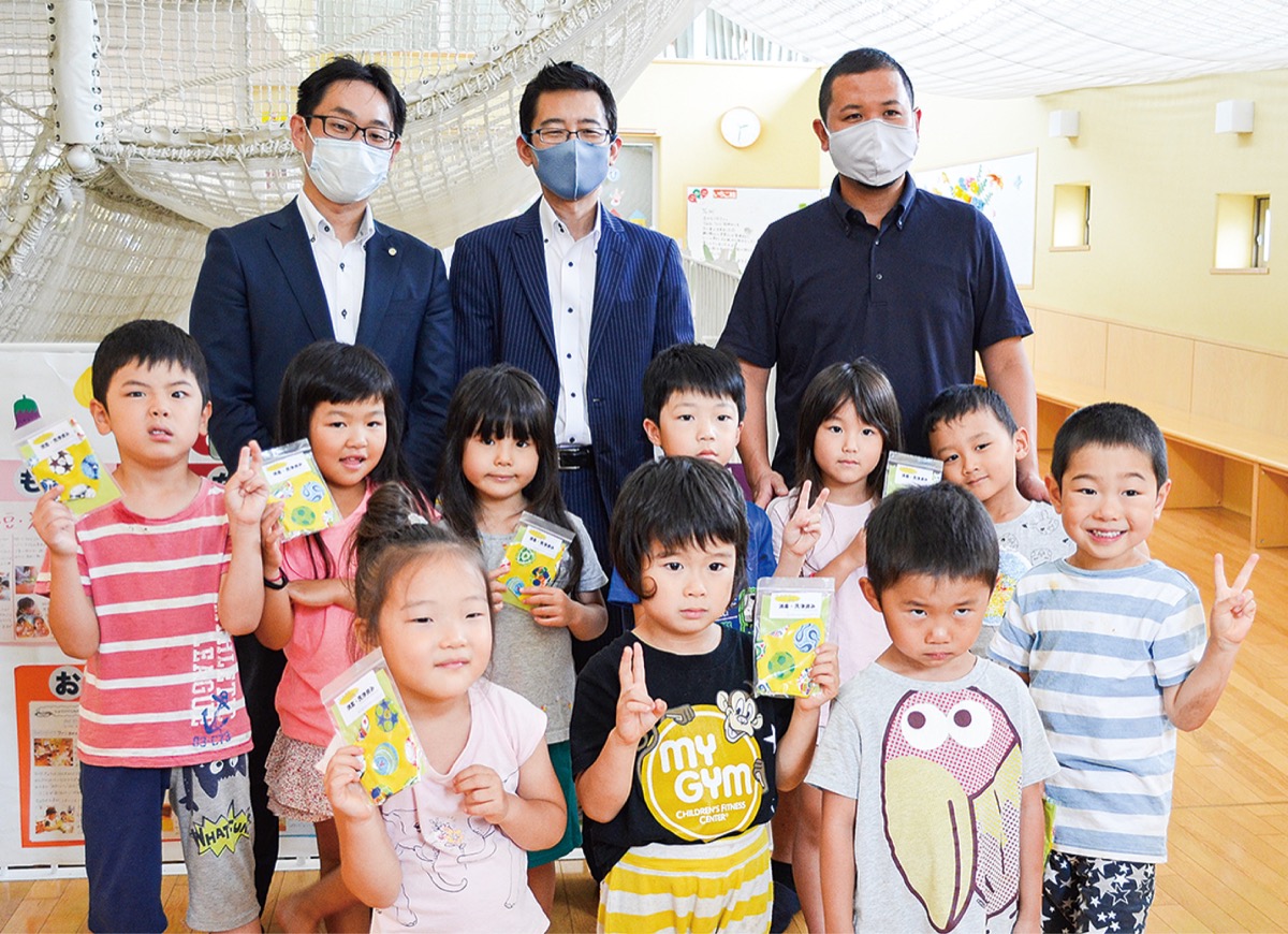 今泉さんとプロジェクトメンバーの高橋真人さんは7月13日、寄付先の一つである上今泉のさくらい保育園(櫻井慶一郎園長)にマスクを届けた。園児はマスクを受け取ると「ありがとう」と元気よく伝えていた。櫻井園長は「子ども用のマスクの寄付はとても嬉しい。洗い替えの一つになると思う」と話した。